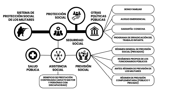 De forma gráfica, puede visualizarse la configuración del sistema de protección social brasileño mediante un infográfico, en el que la asistencia social se encuentra como una categoría de la seguridad social y el BPC como una subcategoría dentro de la asistencia social. Este sistema incluye otros beneficios estatales prestacionales dirigidos a que las personas con elevada vulnerabilidad económica recuperen la dignidad humana y al cumplimiento de los objetivos y fundamentos establecidos en la Carta brasileña de 1988: