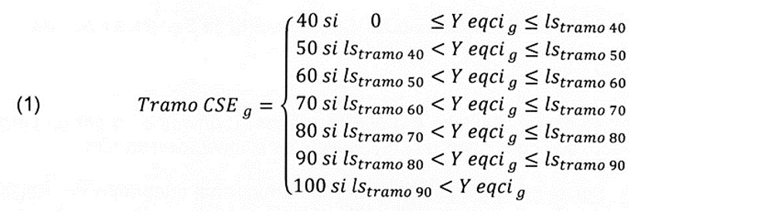 En esta fórmula de cálculo, g = a la unidad de análisis, que corresponde a las personas o grupos de personas, unidas o no por vínculo de parentesco, que compartan un presupuesto de alimentación común, conforme definido en el Decreto n.° 22/2015; Yeqcg = ingreso equivalente corregido de una unidad de análisisg; evaluación de mediosg = evaluación de bienes y servicios a los que accede o posee una unidad de análisisg, lo que permite inferir su nivel socioeconómico; movimiento de tramog = es una evaluación dinámica de la CSE, en la que se establecen condiciones destinadas a evitar saltos abruptos en la calificación que no reflejen cambios de mediano plazo de la unidad de análisisg; y los umbrales CASEN = son los valores de los umbrales que determinan la amplitud de cada tramo de la CSE.